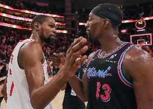 体育资讯3月23日讯 NBA常规赛,火箭123-122力克热火。杜兰特生涯总得分超越乔丹,上升至NBA历史第五。