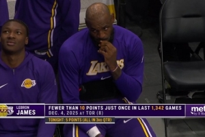 (过去1342场比赛,詹姆斯仅1场没有得分上双)