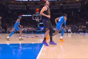 湖人今日客战雷霆,第三节,东契奇疑似无对抗腿筋受伤。