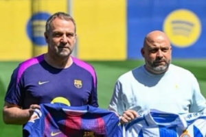 世体:甘伯体育城举行巴萨对阵西班牙人赛前传统的主帅合影